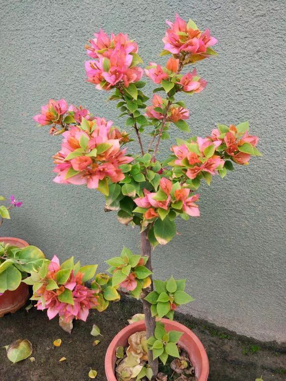 三角梅卡亚塔的花颜色为紫红色或者粉红色,2-10朵成一束,生长于老枝和主干上,主干上的较多,越是到上部分嫩枝上越少。