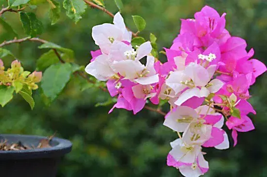 金心双色三角梅是名贵也是最经典的三角梅品种。此花花色变化不定,白色、玫红、艳红三种颜色交替变化,有时还岀现半红半白的景象 ,观赏价值很高。