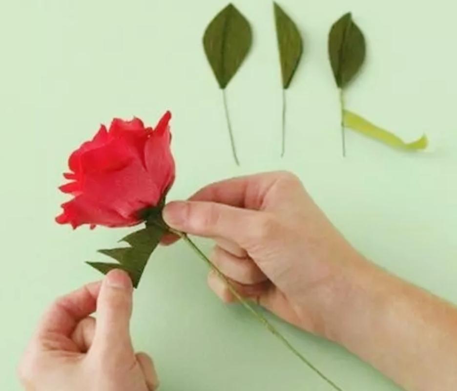 花朵固定几圈后,样子觉得可以,就开始包裹叶子,绕几圈用绿色胶布裹起来就行。