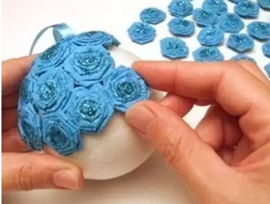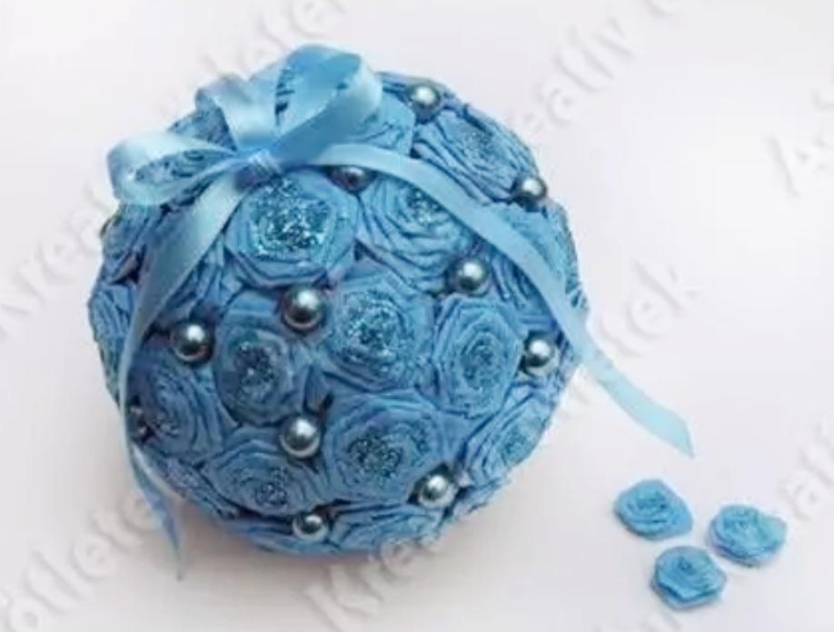 准备一个圆形泡沫球 丝带、珍珠、纸片,要先把丝带从底部戳破至另一边,也可以最后制作蝴蝶结粘上去。