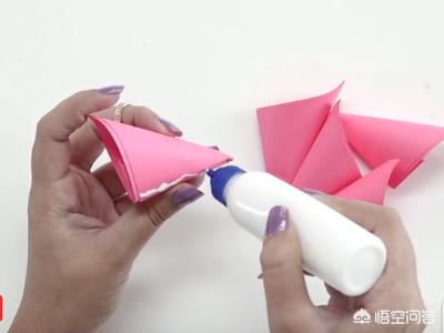 10、将另外4张纸以同样的方式,折出花朵的其余四部分,在每个花瓣接口的位置涂上胶水。