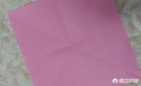 2、然后把彩纸的两条中线对折,翻到背面后再把两条对角线对折,要折出个米字型。