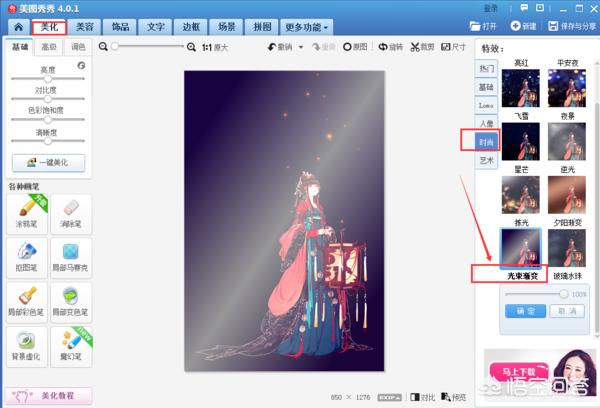 1、使用美图秀秀做一束太阳光撒下来的特效,可以使用“时尚”特效里的【光束渐变】,调整透明度。