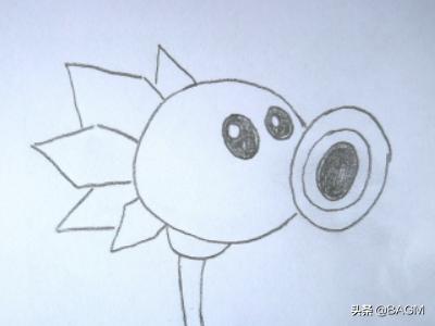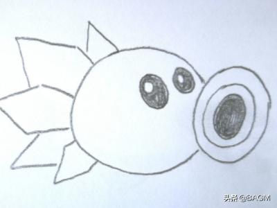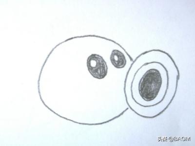 2、在右边的缺口处画一个小一些的圆,圆里面再套两个小圆。其中最小的圆涂成黑色,这是冰豌豆射手的炮口。