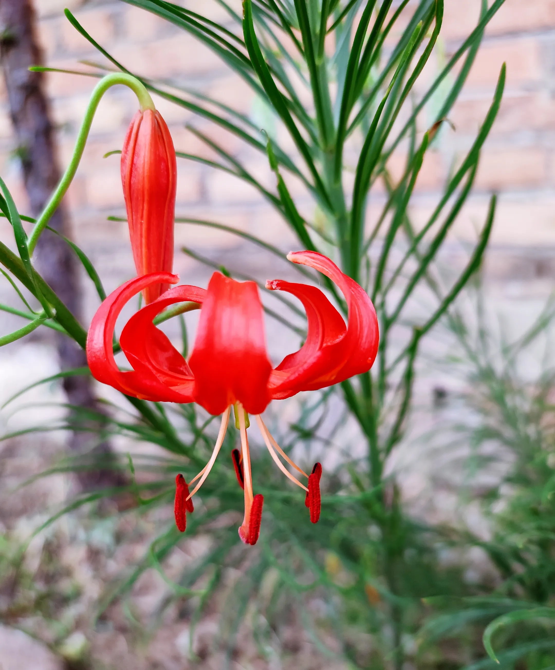 山丹丹花,学名斑百合,别名红百合,生活中中经常被称为“山丹丹花”,百合科,多年生草本。地下具卵球形鳞茎,有少数白色肉质鳞片。茎直立,高30─60厘米,无毛。叶线状至线状披针形,边缘和背面脉上有乳突。无珠芽。花一至数朵,生于茎端和叶腋内,直立,夏初开花;花被片六枚,两轮,披针形或长椭圆形;朱红色或橘红色,内面有紫褐色斑点,开放后开展,但不向外反卷或稍反卷。蒴果椭圆形。