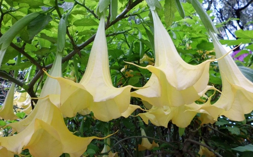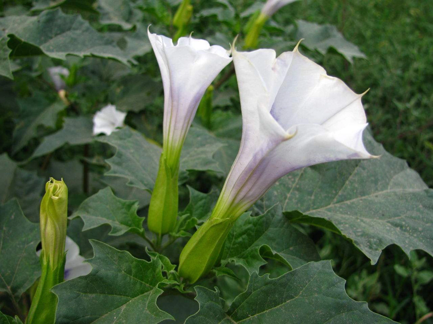 曼陀罗花又叫洋金花、大喇叭花、山茄子、夕颜、醉心花、狗核桃、醉仙桃等,果实名为:狗核桃、毛苹果。为茄科曼陀罗属、一年生直立草本植物,原产印度,现广泛分布全球,我国各地均有野生或栽培,主产在华南地区,以广西最多。花期6-8月[1],果期6-10月,喜温暖、向阳及排水良好的砂质壤土。多野生在田间、沟旁、道边、河岸、山坡等地方,主要危害棉花、豆类、薯类、蔬菜等,有剧毒。