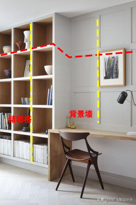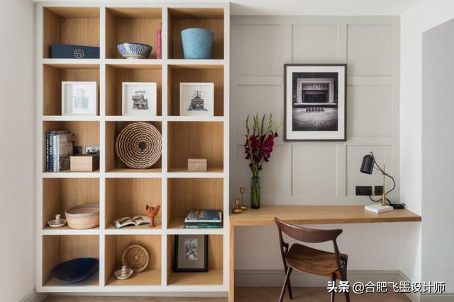 和开放式储物格搭配,储物格本身就带有井字形样式,侧边墙在延伸做井字框背景墙,线条更强,两个空间相呼应!书架/开放式展示架也不会显得太单调!
