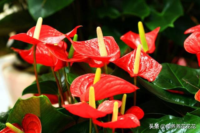 第3种就是红掌,红掌粉掌他们都是一样的,都是每长一片叶子都会长出一个花苞来,如果你养的年头久,它长叶速度比较快的话,到时候一次就能够开花爆盆,而且它的单花花期是非常长的,一朵花养好了能开1~2个月的时间,我们养它的话一定不要暴晒,它非常的怕强光,我们每天给它见1~2个小时的散射光照,保证着土表干了,及时的给它浇透水,土一定要配置透气性好的,肥料的话因为它一直长一直开花,我们可以选择用磷钾元素含量高,其他元素也不缺失的,也可以去给他用多元素的肥料,一个月给他2~3次,顺便给他补充一下土壤的酸性,可以用硫酸亚铁,也可以用螯合铁,一个月一次就可以了,这样我们养的红掌就能够一直长一直开花不间断。