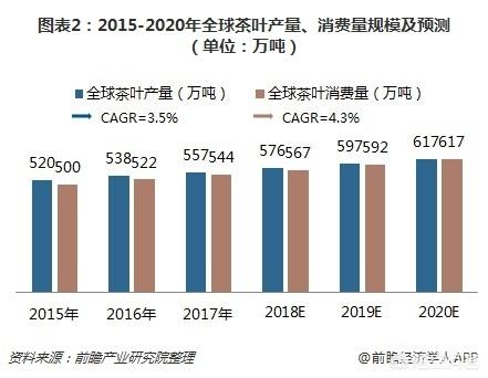 近年来,全球茶叶市场需求持续增长,其中,亚太地区的绿茶消费增长强劲,而北美、西欧的红茶市场也已发展成熟。统计数据显示,2017年的茶叶消费量约为544万吨,2015-2017年间年均复合增长率达4.3%,预计2018年消费量为567万吨,到2020年全球茶叶消费量将超600万吨。