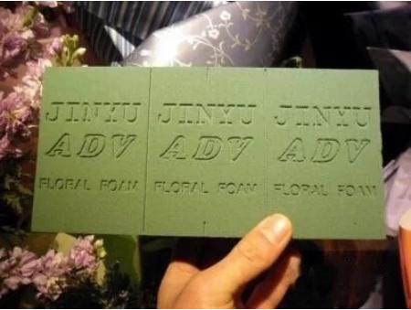 3、将花枝排列好后,扦插到鲜花泥中,鲜花泥浸水后,使用透明塑料包装纸包裹,并使用透明胶扎紧。