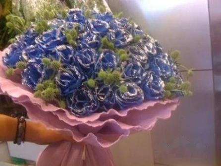 2.用剪刀把花束包装薄纱纸剪成大正方形,边长的一半大概高于花束最顶部5CM,最后把花束包装薄纱纸包住鲜花,整理折好薄纱的皱褶,然后用长麻绳或者铁丝再捆住固定薄纱纸。