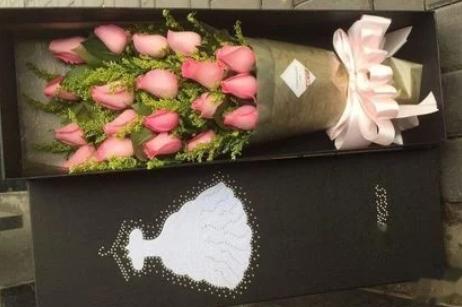 5、最后将花束装盒,以便运输,如果是马上送人,需要在花束上撒上水珠更加好看,如果需要摆放一段时间,则在鲜花泥中多加点水。