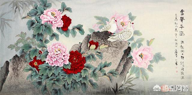 牡丹是国画花鸟画中经常描绘的意象,历代诗人画家有着无数赞美牡丹的诗句和画作,不仅在于牡丹美丽的形态外表,还寄托了诗人、画家的美好情感。两只热爱和平的白色鸽子在岩石上相伴而立。牡丹象征吉祥富贵,鸽子代表和平与吉祥,本幅作品题款《富贵平安》,表达了作者对和谐、美满生活的向往与追求。