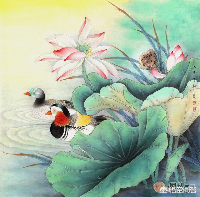 和和美美,如意吉祥,恩爱白头,这些都是赋予鸳鸯的美好寓意。荷花盛开,还有一个莲蓬格外的突出,这就表现了画作的高超技术,蓬头描绘的特别逼真。在硕大的荷叶下面,游出来了两只鸳鸯,恩爱有佳,这幅斗方画挂在卧室,那真是美妙绝伦啊,如果是夫妻双方的卧室,还可以寓意夫妻和睦,幸福生活呢。