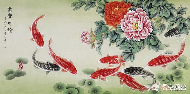 在王一容老师这幅画中,池塘旁边,一株牡丹茁壮成长,枝干粗壮,枝头绿叶层生,硕大的牡丹花竞相绽放,五颜六色,鲜艳夺目。刚刚长出的叶子展示着它那特有的嫩绿,彰显旺盛的生命力。池塘中九条鲤鱼正在水中嬉戏,游动的鲤鱼与牡丹花形成动与静的对比呼应。鲤鱼表示连年有余、年年有余之意。风水上以水为财,红色的鲤鱼有旺运的含义,此类作品常被人们称之为旺财图。