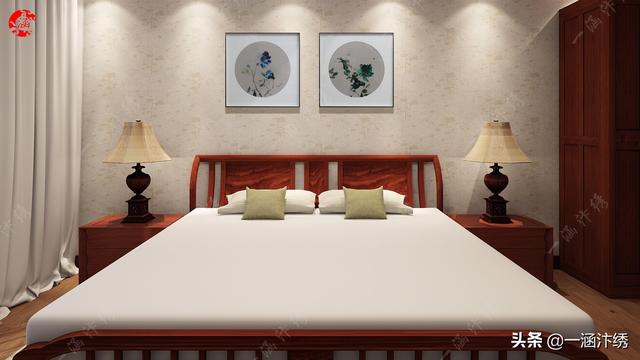 卧室在装饰上不追求华丽,更追求舒适和温馨,床头的背景墙是装饰的重点,好的装饰能够有效的解决空间的乏味感,显得妙趣横生。自然大方的装饰不需要做过多的修饰,选择一幅温馨吉祥的字画挂上即可,有着独特的艺术格调,显得更有品味。