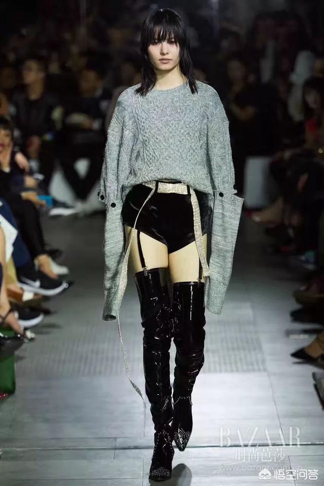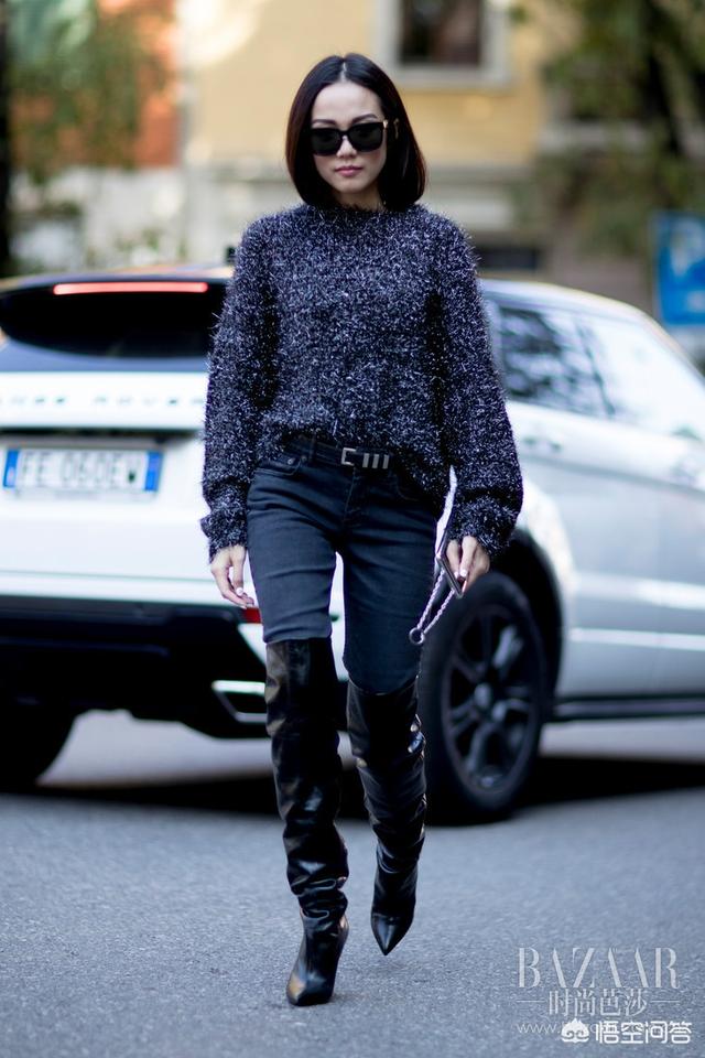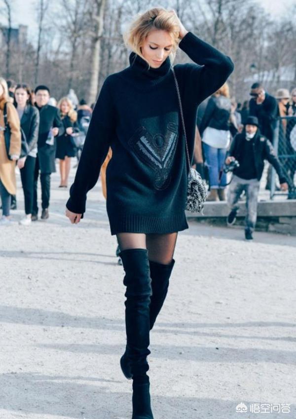 一件oversize廓形的毛衣,上身不仅可以很好的遮住腰身肉肉,修饰身形,同时还能帮你遮住整个臀部,就算是梨型身材的MM,也可以放心驾驭,下半身穿着一双黑丝袜和过膝长靴,高高的靴筒紧包裹住大半条腿,露出一小截大腿肌肤,性感撩人,整个造型干练利落,还仿佛增高了十几厘米!