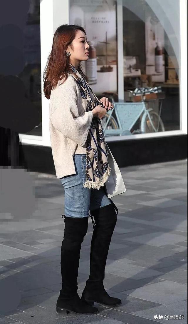 二、紧身牛仔裤+过膝靴