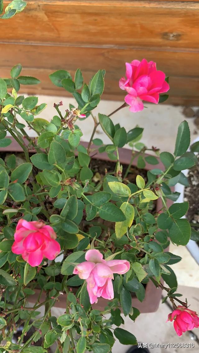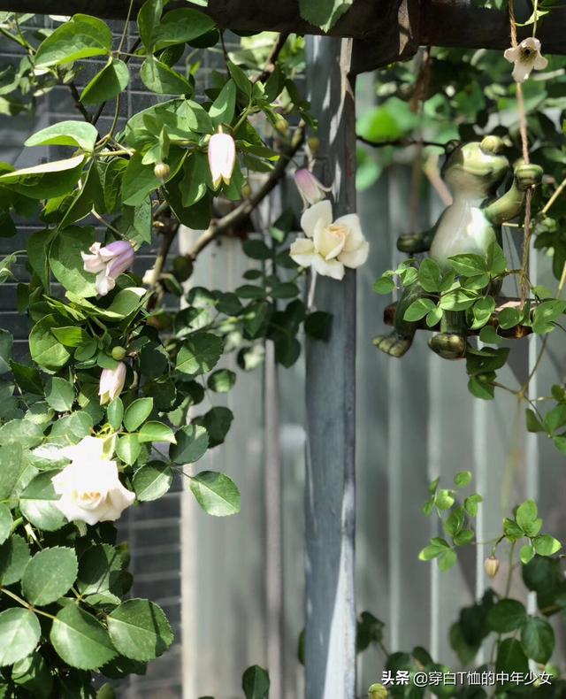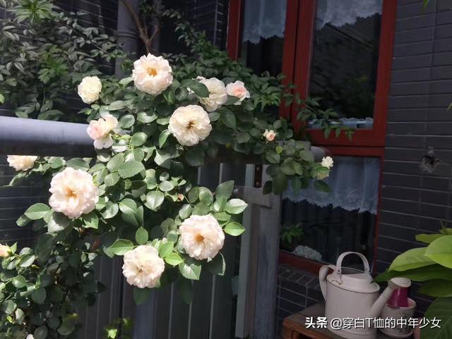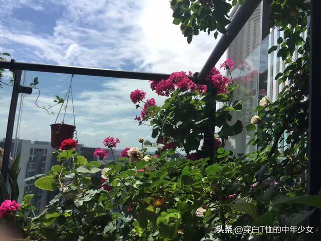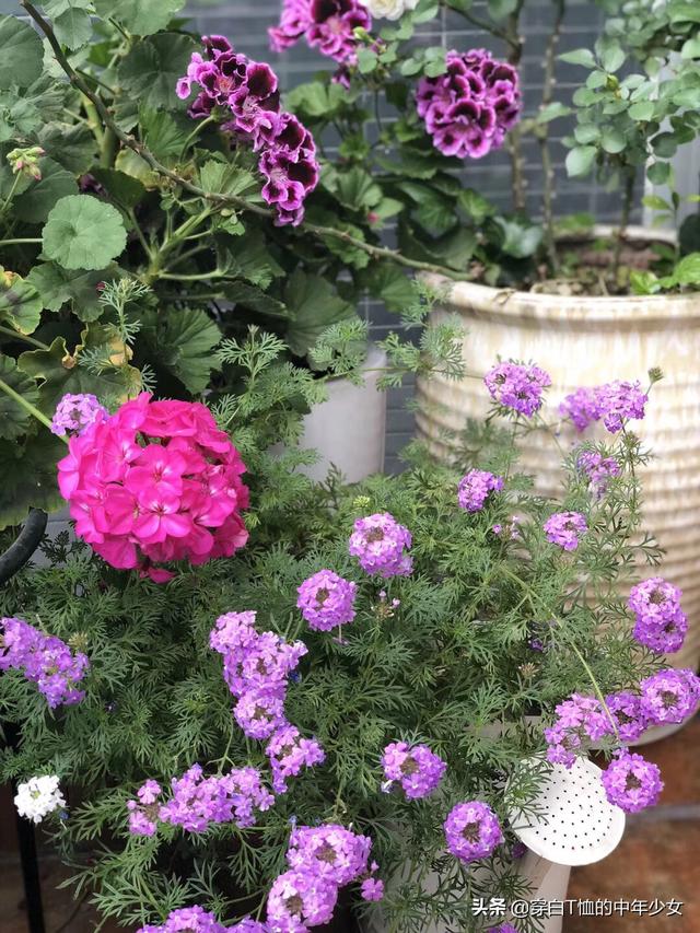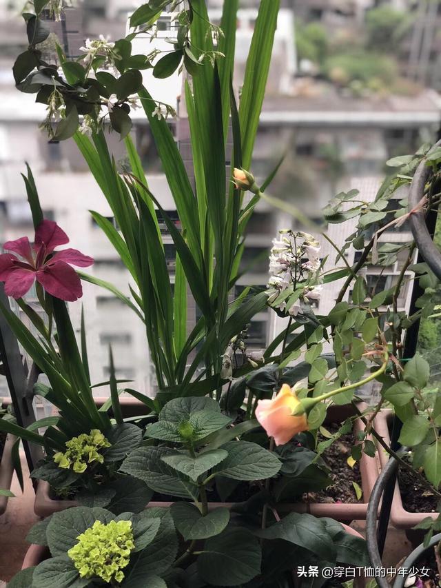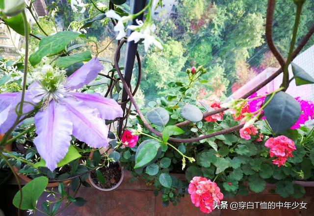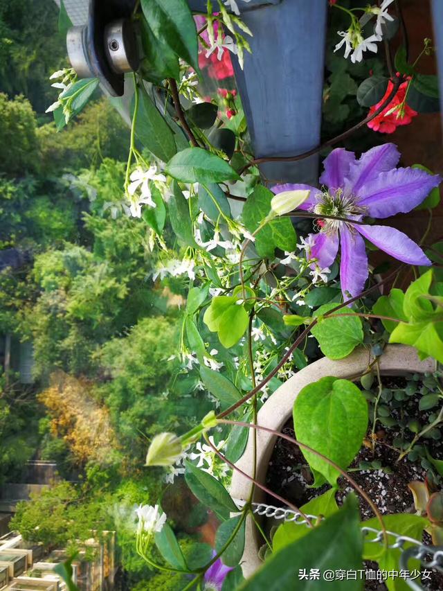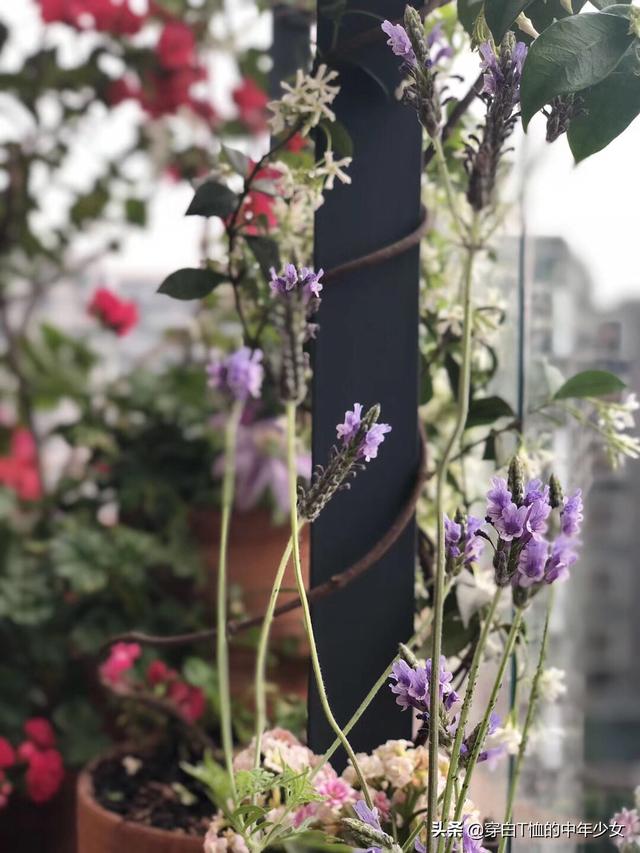 最爱我四月的阳台,月季、风车茉莉、铁线莲各占半壁江山,间以美女樱、薰衣草和天竺葵,我比较注重色彩搭配和高低层次错落