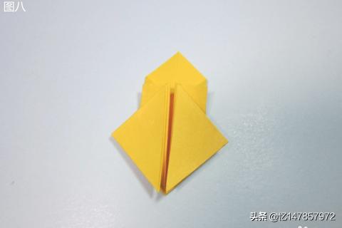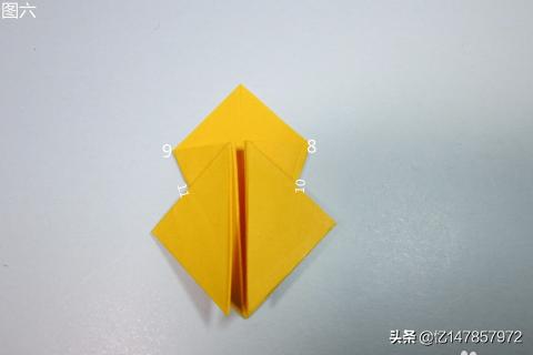 8、再将角8与角9展开,从两角的内部撑开,沿着两侧的折痕,将两角压折入内部,这样一个部件就折好了。