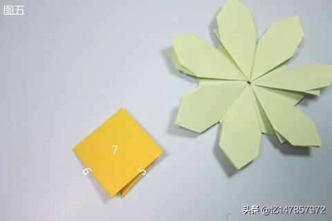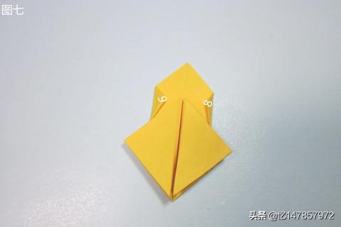 6、先将图五中的叠边5与叠边6背面的部分翻折出来,再将叠边5与叠边6分别翻折至中间折痕7,得到图六。
