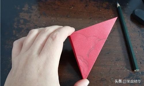 3、把左下角向右上方折,再把下边的角向后折,边缘线要对齐。