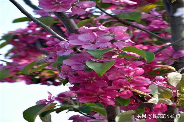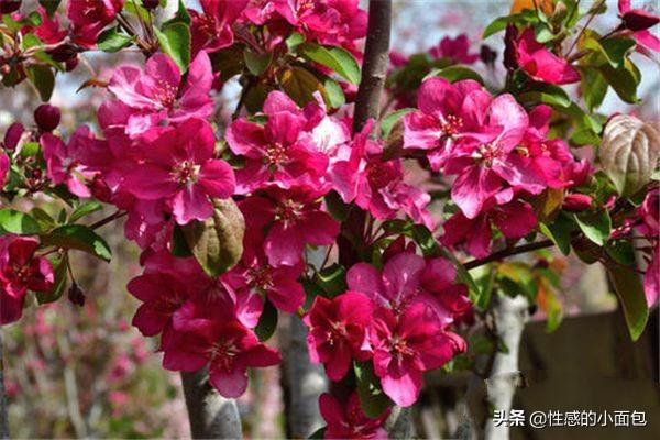 石海棠是一种城市绿化的彩色树种,它的叶子是红的、花是红色、果也是红色,就连枝干也是红红的颜色。就像是一株红色的宝石树一样,所以得名红宝石海棠。花期是在4~5月,从开花到结果,一树红色,十分漂亮。