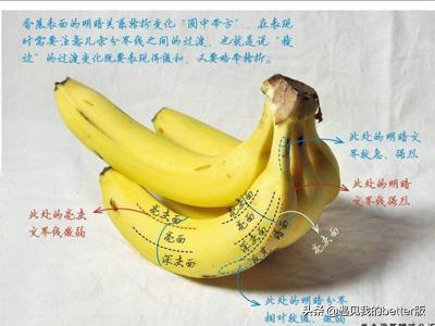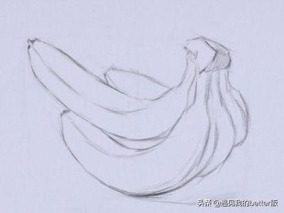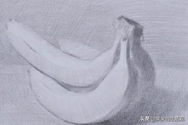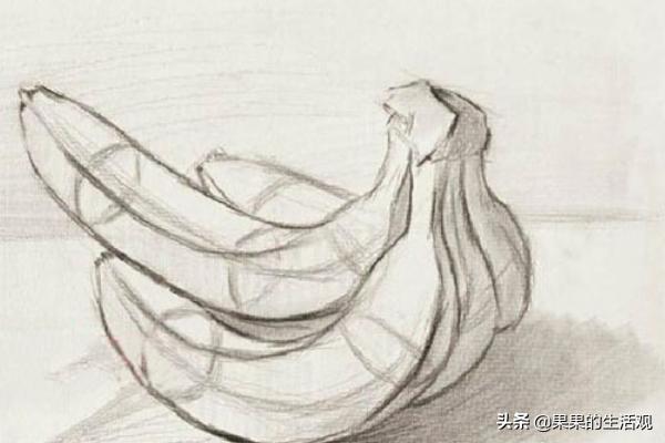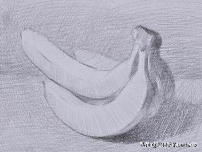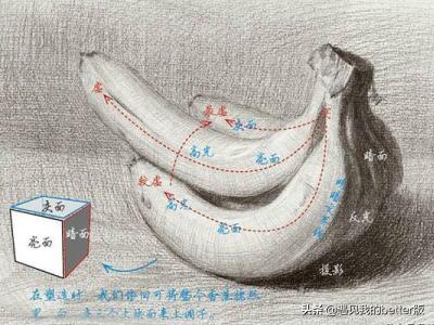 1)单个香蕉,香蕉的形体是方体与圆柱体组合而成的,所以只要我们学会了画方体和圆柱体的造型规律,了解了其中的素描关系,香蕉的表现也就迎刃而解了。
